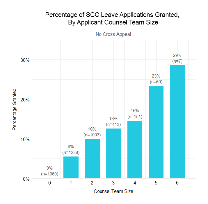 Our analysis suggests that larger team sizes may lead to an increased likelihood of success for applicants in getting leave to the Supreme Court of Canada. The data do not tell us why larger teams are associated with better outcomes, but there are several plausible mechanisms: