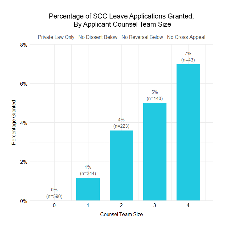 As one example, we limited the set to only private law cases where the Court of Appeal below unanimously dismissed the appeal. These are cases that our previous work suggested had a much lower likelihood of getting leave to appeal. While the probability of getting leave was lower, the relationship remained constant: larger team sizes were associated with a greater likelihood of leave being granted.
