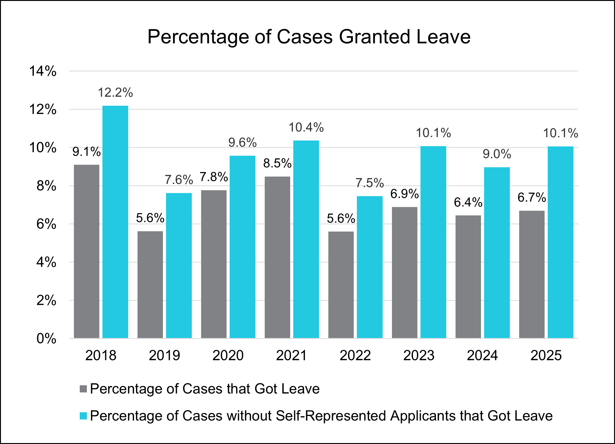 By contrast, grant rates themselves were strikingly stable. Overall, 6.7% of leave applications were granted in 2025. Among represented applicants, the grant rate was 10.1%, almost identical to prior years. The Court was not tougher; it simply had fewer serious contenders before it.