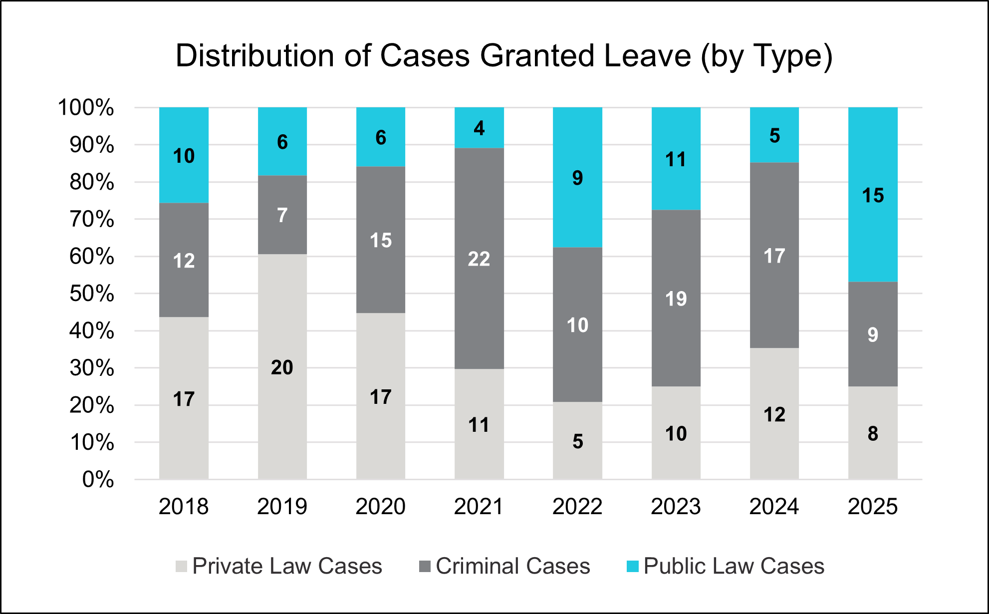Looking first at leave applications decided, private law continues to dominate the docket. In 2025, private law cases accounted for 46% of all leave applications decided, with criminal and public law cases roughly splitting the remainder.