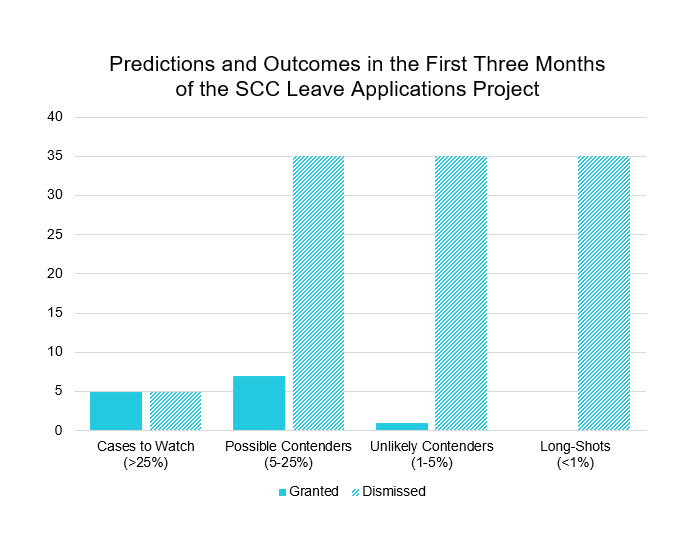 Three months ago, we launched our Supreme Court of Canada Leave Project. Part of that project is a machine learning algorithm that provides predictions of the likelihood of different cases getting leave to the Supreme Court. Since launch, we’ve made fourteen weekly predictions for leave applications to the Supreme Court of Canada. Our model has provided predictions for the likelihood that leave would be granted from 123 decisions of Courts of Appeal across the country.