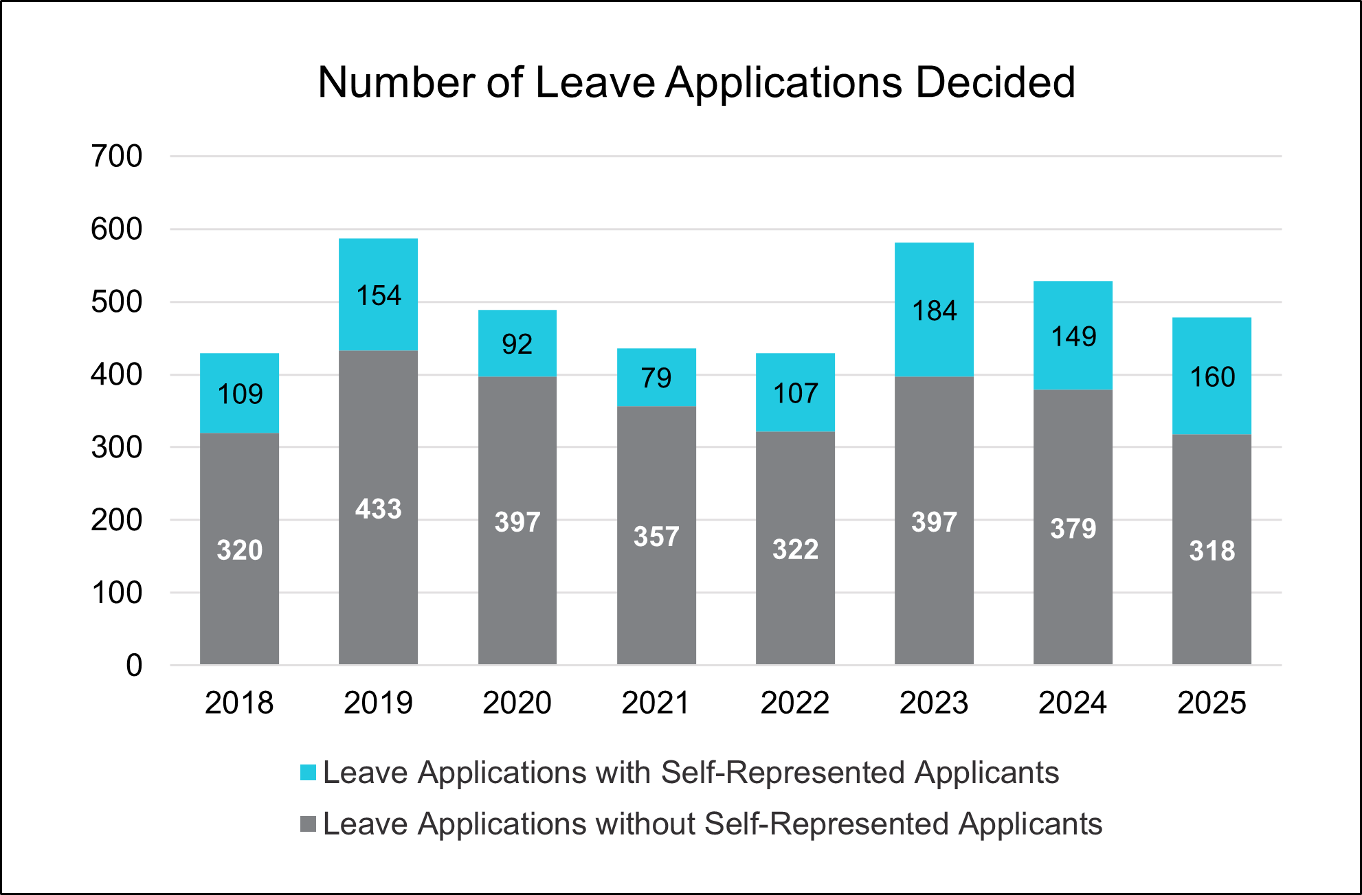 As the data show, the total number of leave applications decided dropped meaningfully in 2025, especially in cases where applicants were represented by counsel.