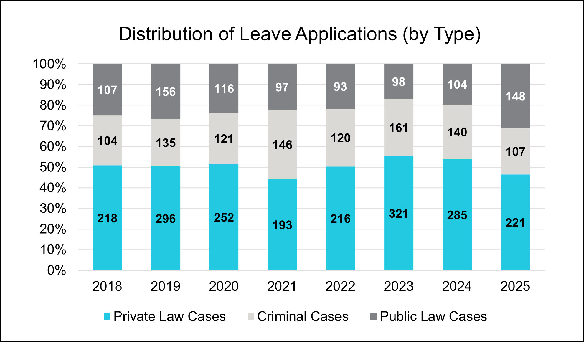 Looking first at leave applications decided, private law continues to dominate the docket. In 2025, private law cases accounted for 46% of all leave applications decided, with criminal and public law cases roughly splitting the remainder.