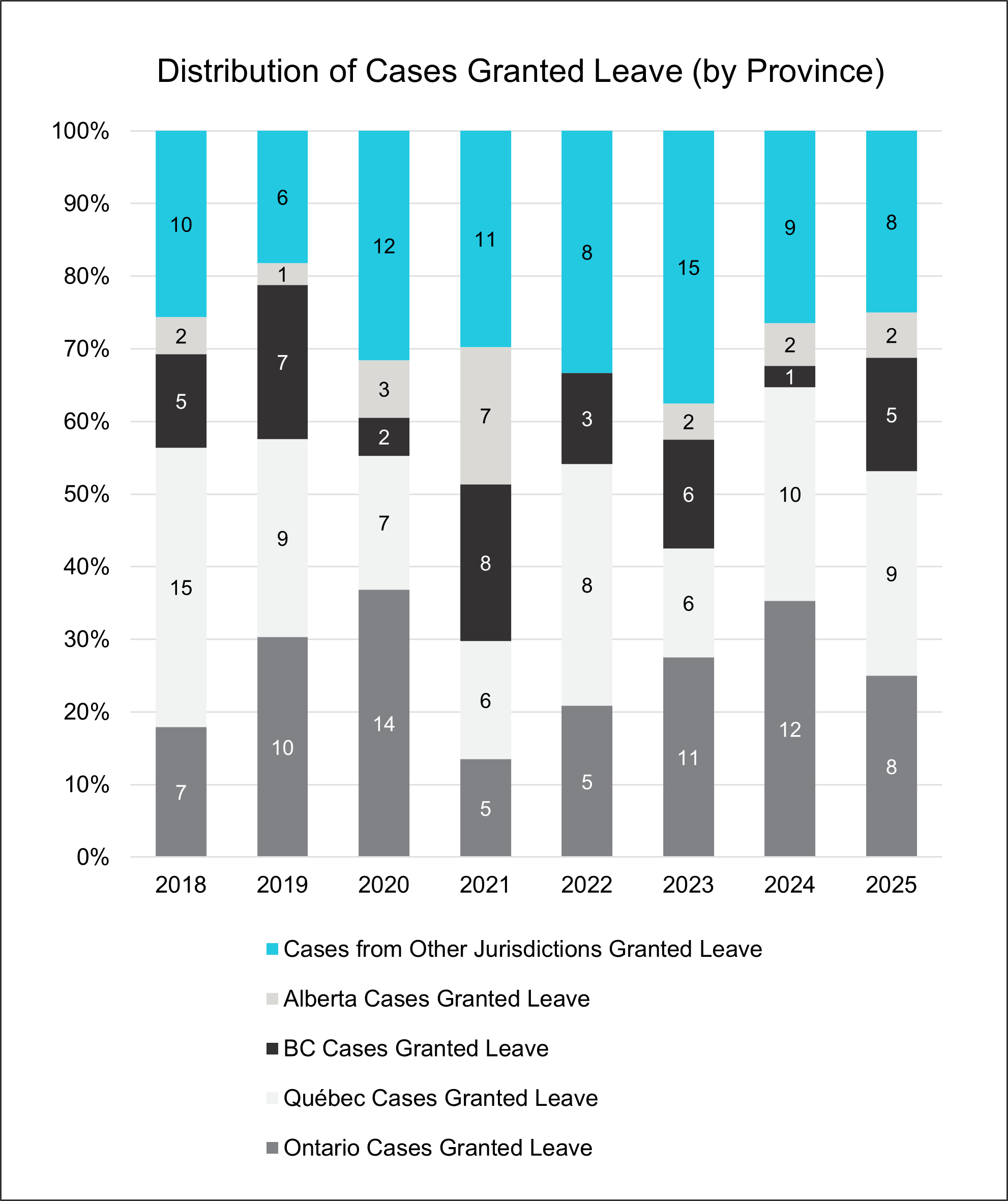 Geographically, 2025 looked much like prior years. Ontario and Québec together accounted for just over half of all leave grants, consistent with their share of appellate litigation nationally.