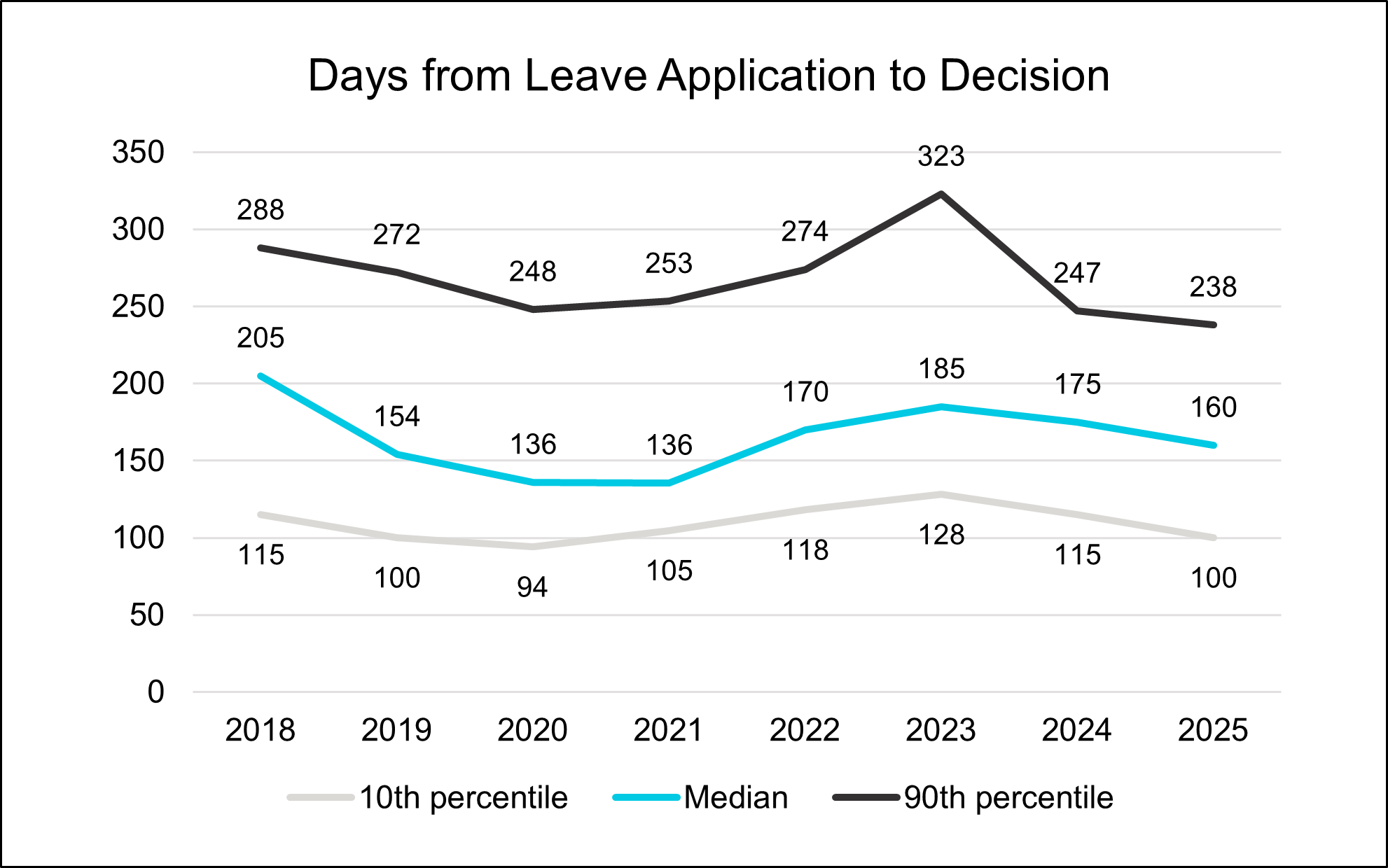 In 2025, the median time to decide a leave application was just 160 days.
